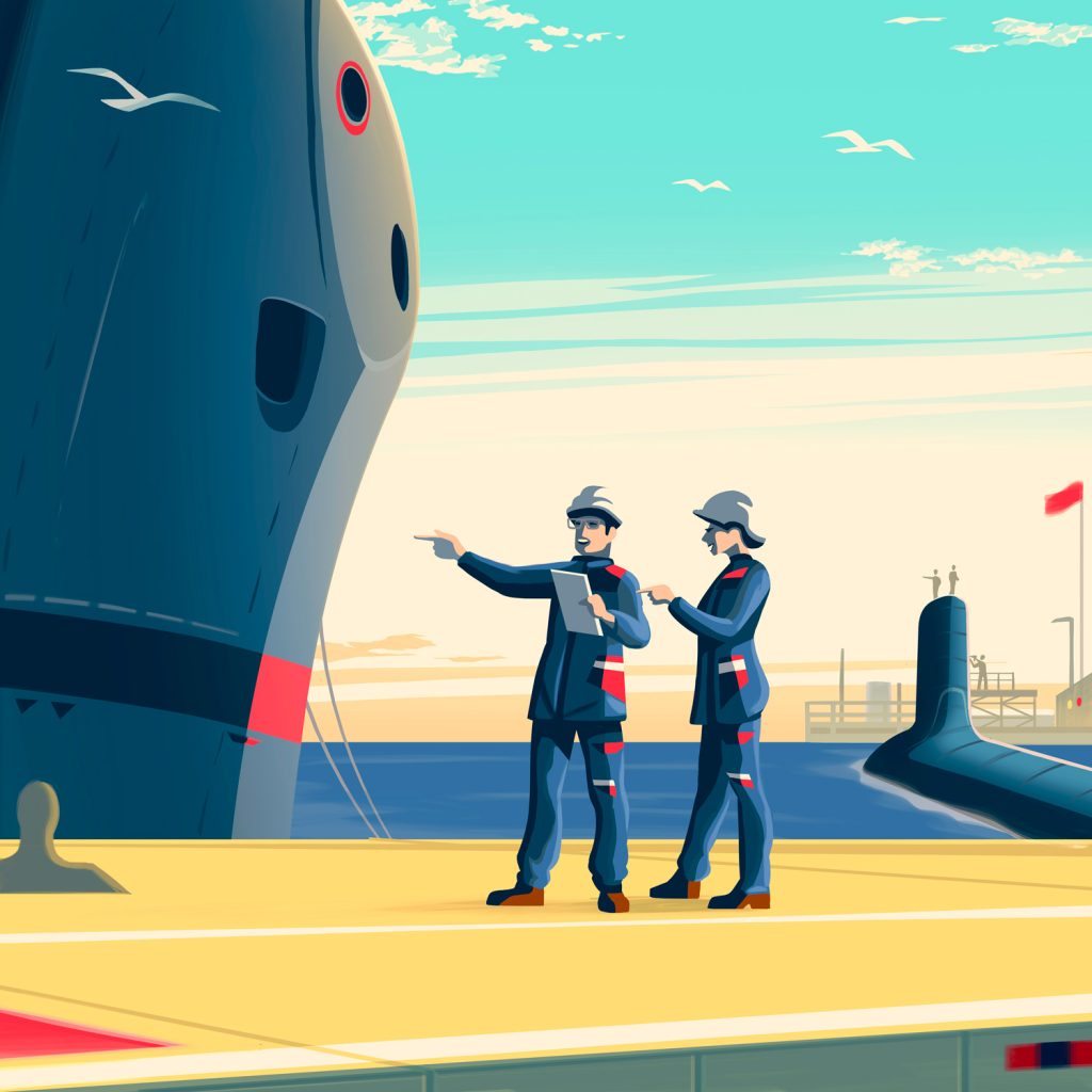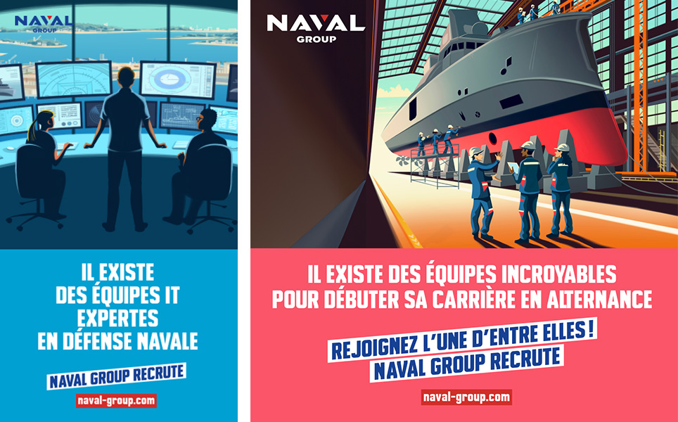 Francesco Bongiorni signe les illustrations de la campagne de recrutement de Naval Group. À travers un univers graphique fort et narratif, ses créations mettent en lumière les métiers, les savoir-faire et les talents qui font la force du groupe. (@ Agence WAT)